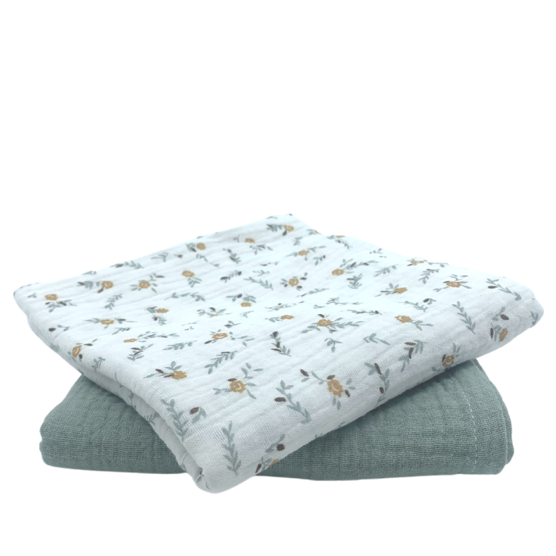 Le premier lange présente un motif fleuri délicat, tandis que le second affiche une teinte vert d'eau, apaisante et neutre. L’ensemble forme un duo harmonieux, parfait pour un trousseau mixte ou pour varier les usages.