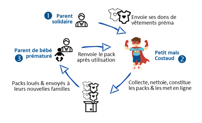 - Nous développons notre plateforme de don et location de vêtements avec le soutien de SOS Préma, de parents et de soignants afin de répondre au mieux à leurs besoins