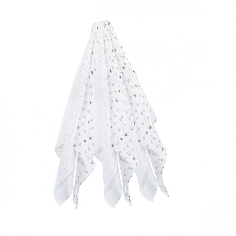 Informations utiles : Lot de 6 langes / Usages bavoir, doudou, couverture de couveuse, couverture de poussette, couche lavable, protège matelas ou de table à langer / 2 motifs par boite : petites étoiles, grandes étoiles / Se lave à 30°C