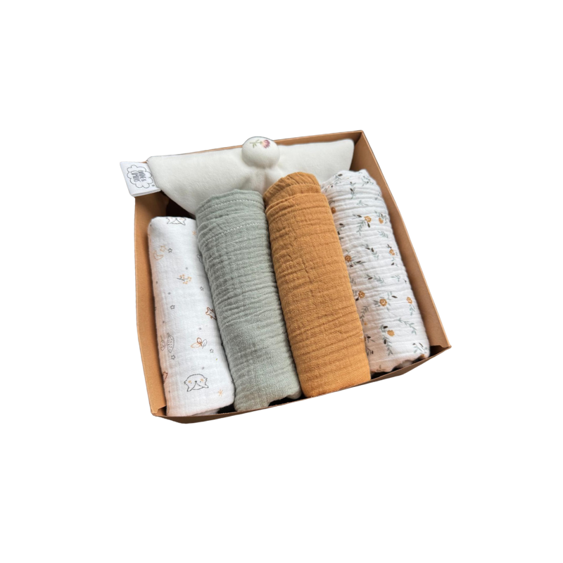 Un coffret tendre et complet : 4 langes en gaze de coton française et un doudou Ouatine & Cumulus tout doux pour envelopper bébé de douceur dès la naissance.